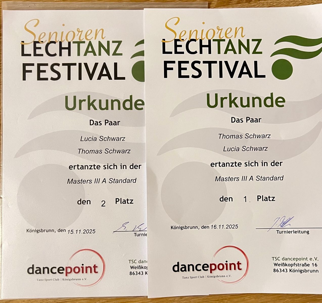 Ihr erstes Turnier in der MAS III D tanzten sie im April 2023 und kamen gleich auf Platz 2. Bei der Bayerischen Meisterschaft im selben Jahr holten sie sich den Meistertitel und stiegen in die C-Klasse auf, in der sie sich auf Platz 3 tanzten. Nach einer längeren Turnierpause, in der die Technik verfeinert und an der Performance gearbeitet wurde, entschieden die beiden, die Bayerische Meisterschaft mitzutanzen. Das Ergebnis überraschte nicht: Vizemeister in der C, Aufstieg in die B und ein 5. Platz im Finale der B-Klasse.